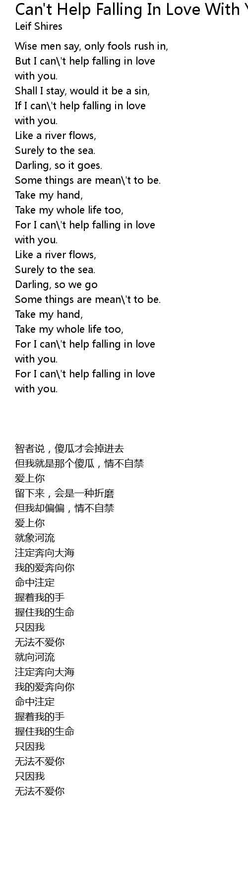 If i can't help falling in love with you Would it be a sin. Shall i stay would it be a sin. But i can't help falling in love with you You may only use this for private study, scholarship, or research. Ukutabs does not own any songs, lyrics or arrangements posted and/or printed. F g am f * c g c if i can't help falling in love with you. Lyrics for can't stop falling in love by w o l f c l u b. Shall i stay, would it be a sin? Full and accurate lyrics for can't help falling in love (chinese) from f4: Can't help falling in love with you chords *** elvis presley 1961 (blue hawaii)** capo ii ** intro c g am c g verse 1 c em am f c g wise men say, . But i can't help falling in love with you. Some things are meant to be.